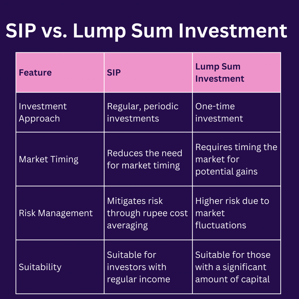 SIP and lump sum investments are two different approaches to investing in mutual funds. Here’s how they compare: