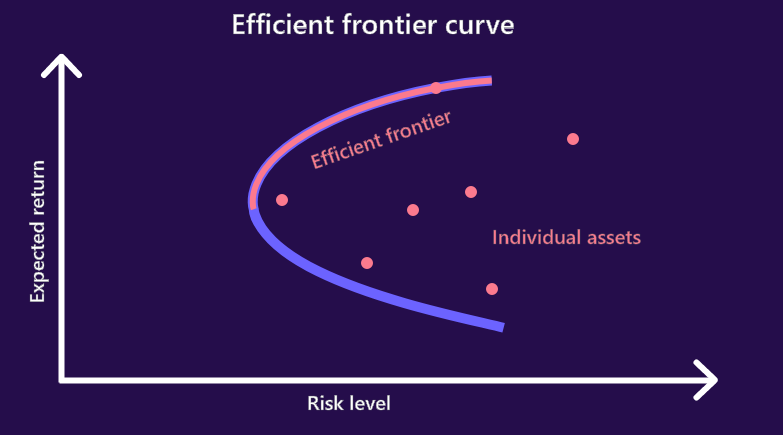 The graph below shows the expected return vs risk level for different portfolio allocations given a number of assets. The upper part of the curve is referred to as the “efficient frontier”, which represents the most efficient portfolio allocations for a combination of assets. This provides the most desirable portfolios, which offer the best returns at any given risk level, or vice-versa allow you to minimise the risk for a desired level of expected return.